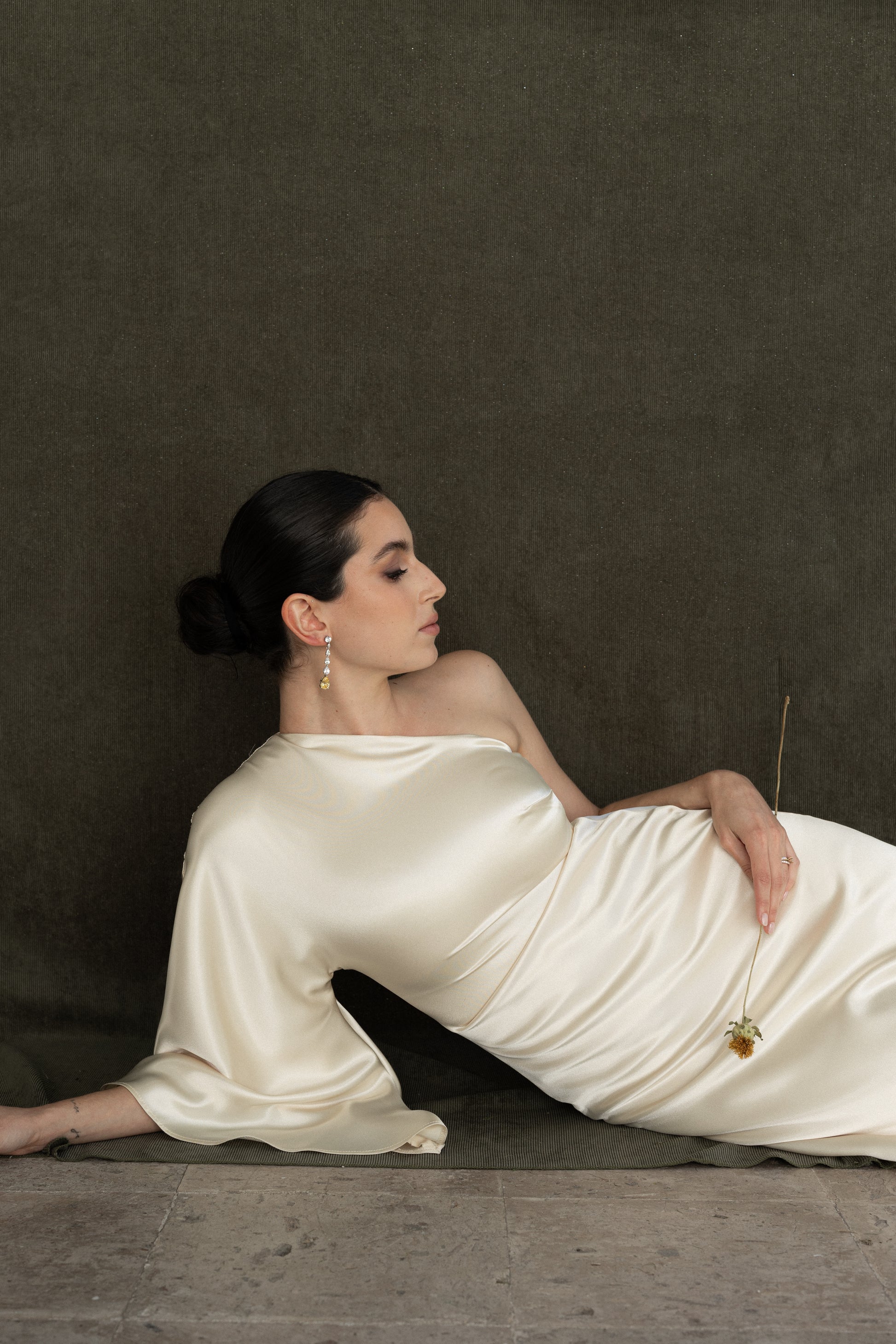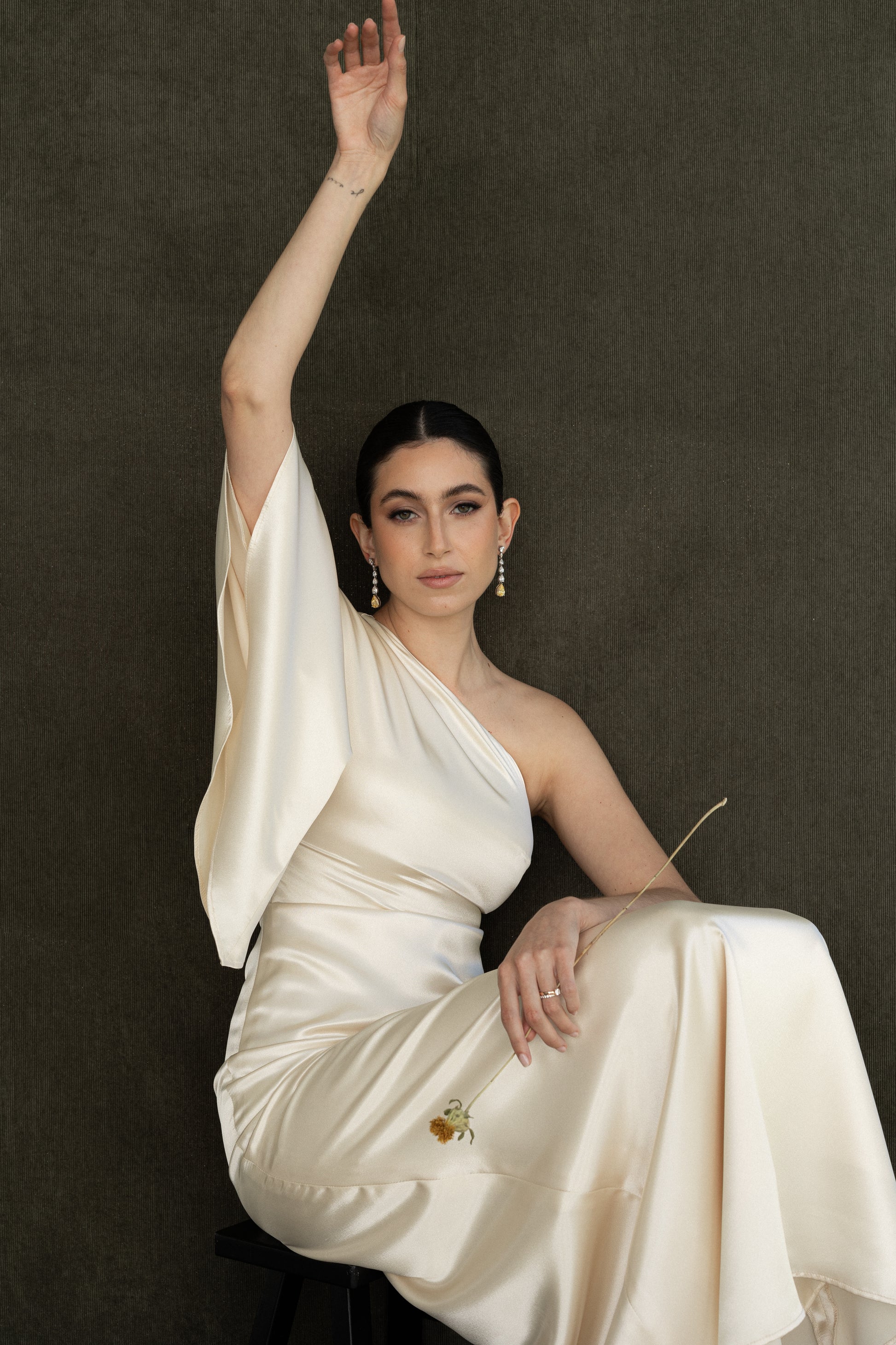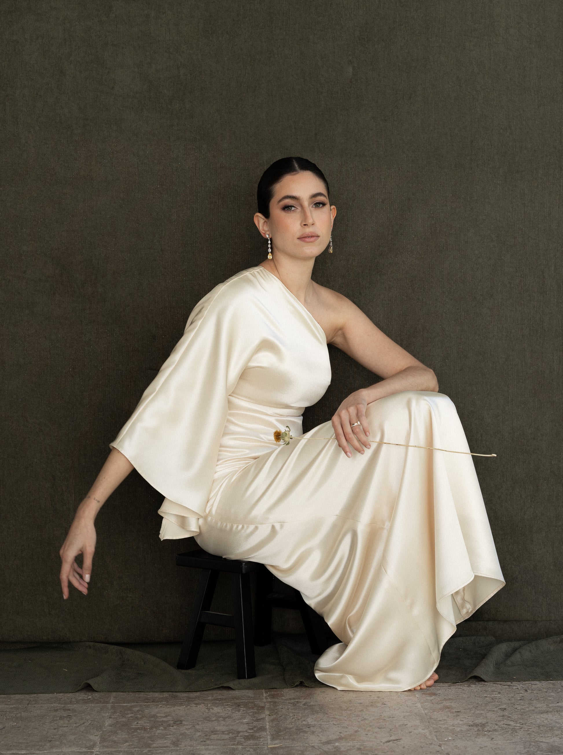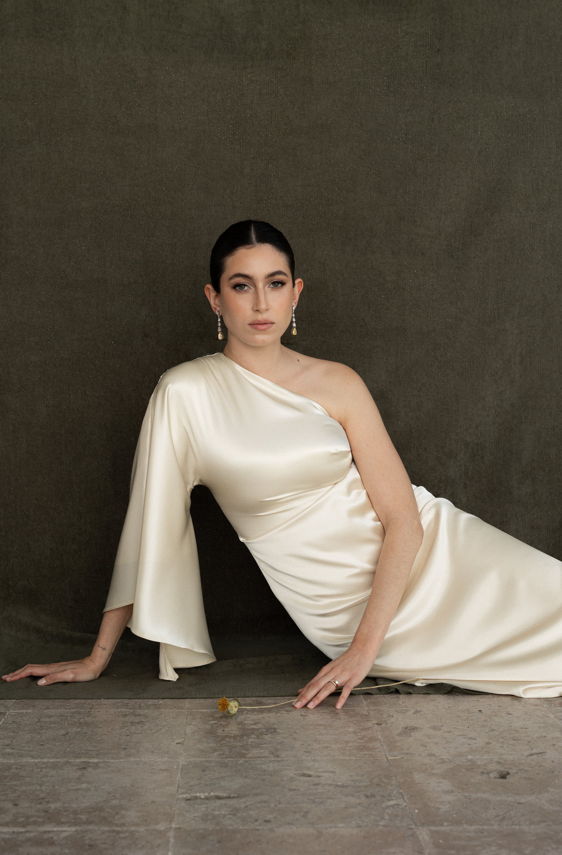 Vestido de un hombro con manga raglán en campana, sin corte en cintura para alargar talle.