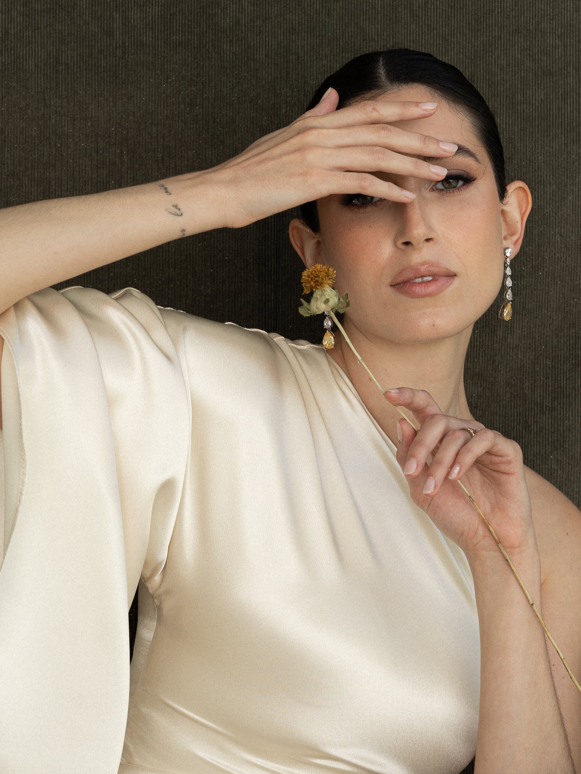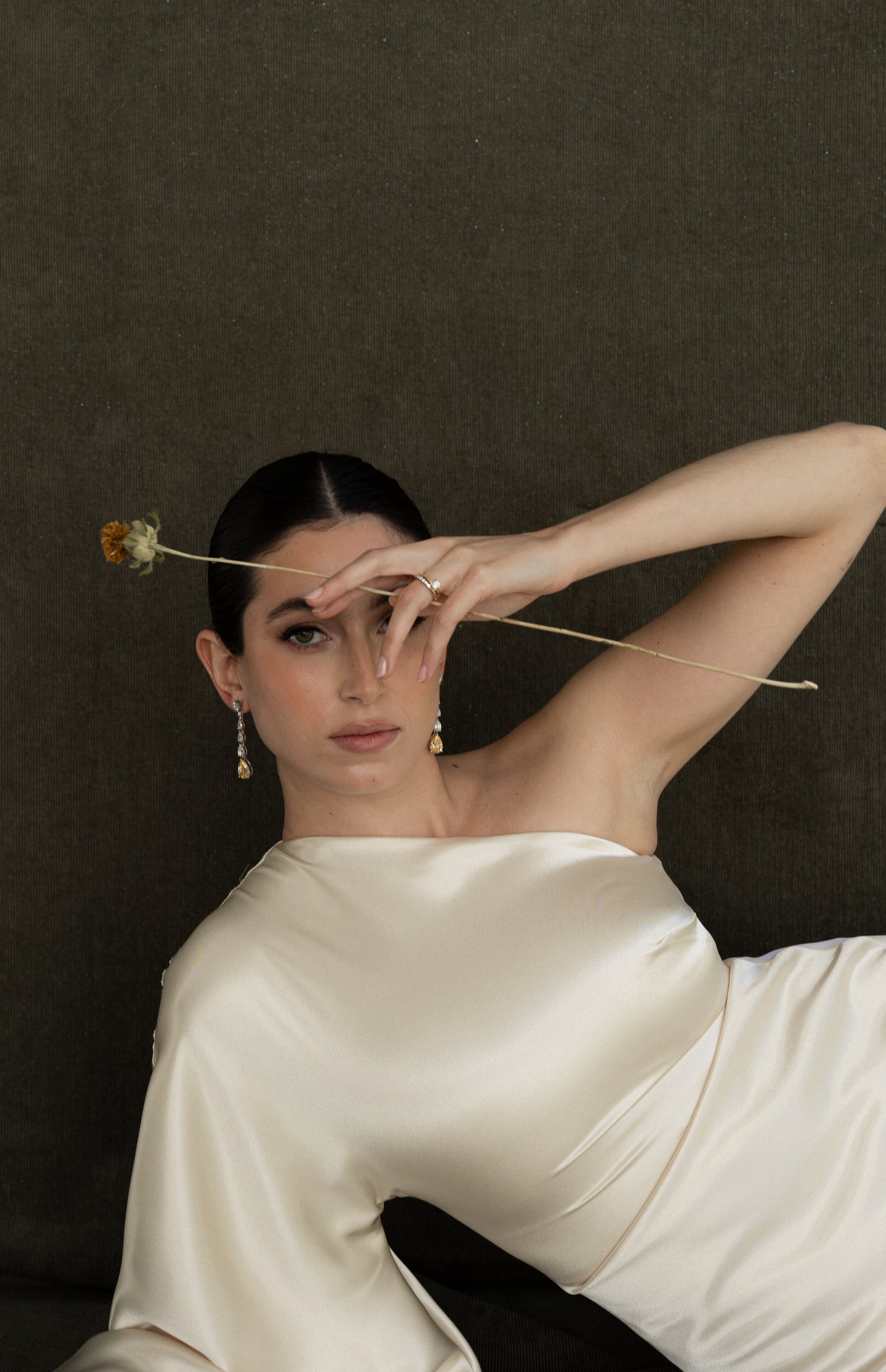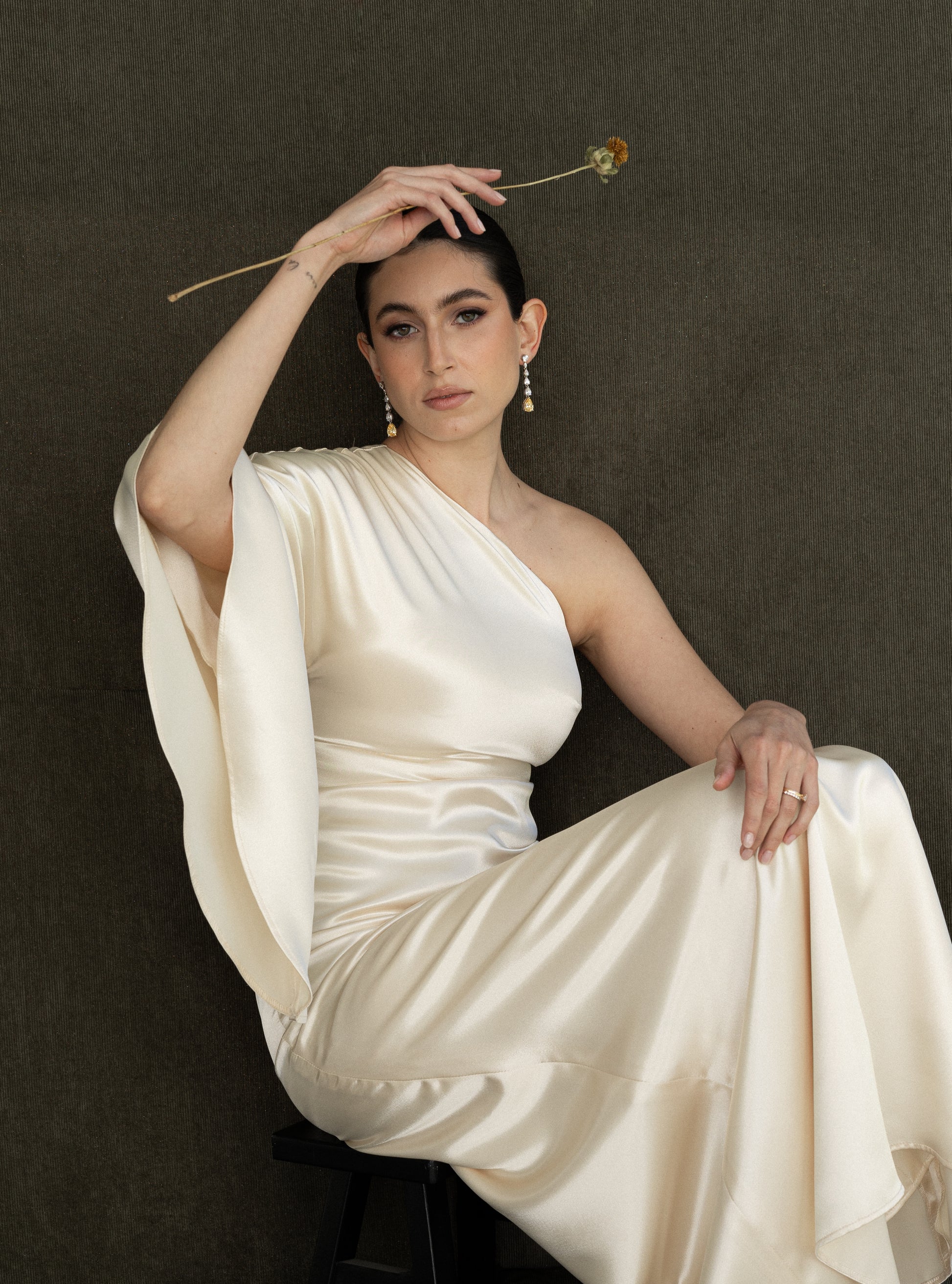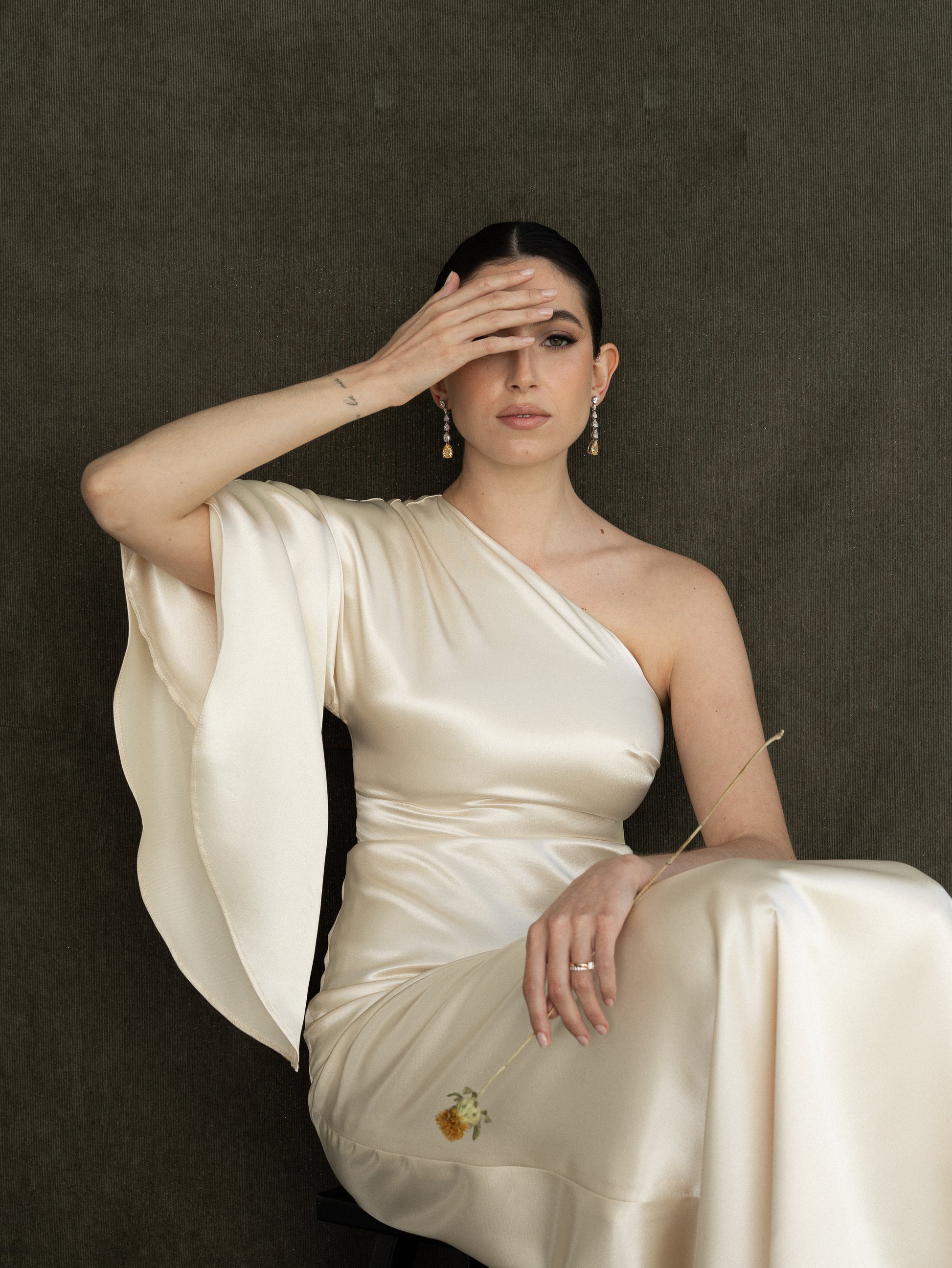 Vestido de un hombro con manga raglán en campana, sin corte en cintura para alargar talle.