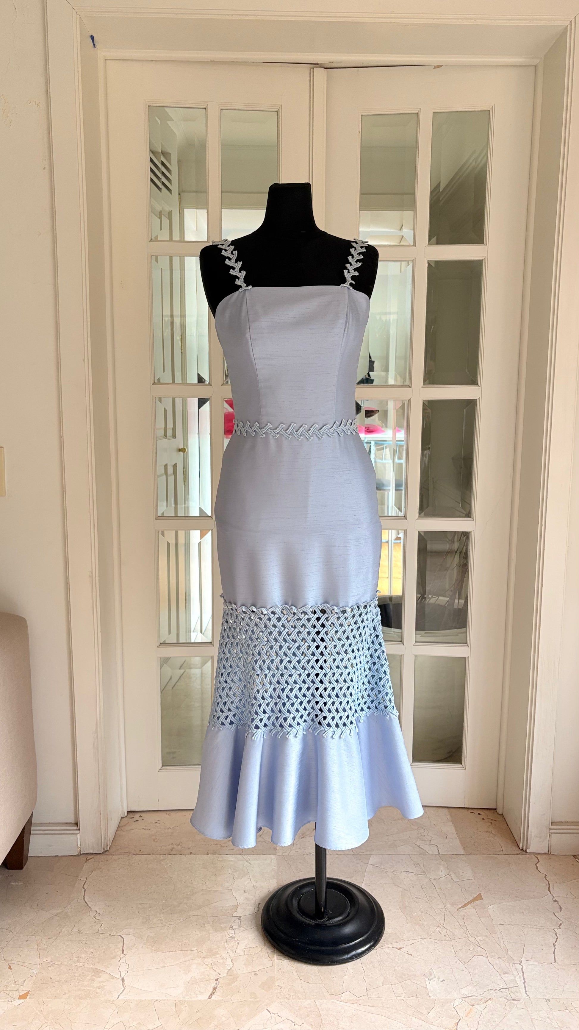 Vestido midi color azul con detalle de guipur.